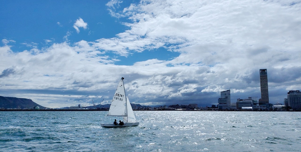 サンポート高松北側に見える美しい瀬戸内海、私たち香川大学ヨット部の活動場所です。エンジンのような動力源のないヨット、自分たちで帆を張り替えながら船を進める感覚は、きっとヨットでしか味わえないでしょう!!